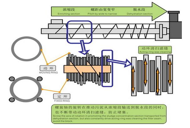 1、脫水機的主體是由固定環(huán)和游動環(huán)相互層疊,螺旋軸貫穿其中形成的過濾裝置.前段為濃縮部,后段為脫水部。