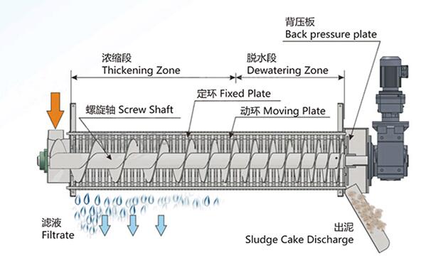 2、脫水:經(jīng)過濃縮的污泥隨著螺旋軸的轉(zhuǎn)動不斷往前移動;沿泥餅出口方向,螺旋軸的螺距逐漸變小,環(huán)與環(huán)之間的間隙也逐漸變小,螺旋腔的體積不斷收縮;在出口處背壓板的作用下,內(nèi)壓逐漸增強,在螺旋推動軸依次連續(xù)運轉(zhuǎn)推動下,污泥中的水分受擠壓排出,濾餅含固量不斷升高,最終實現(xiàn)污泥的連續(xù)脫水。